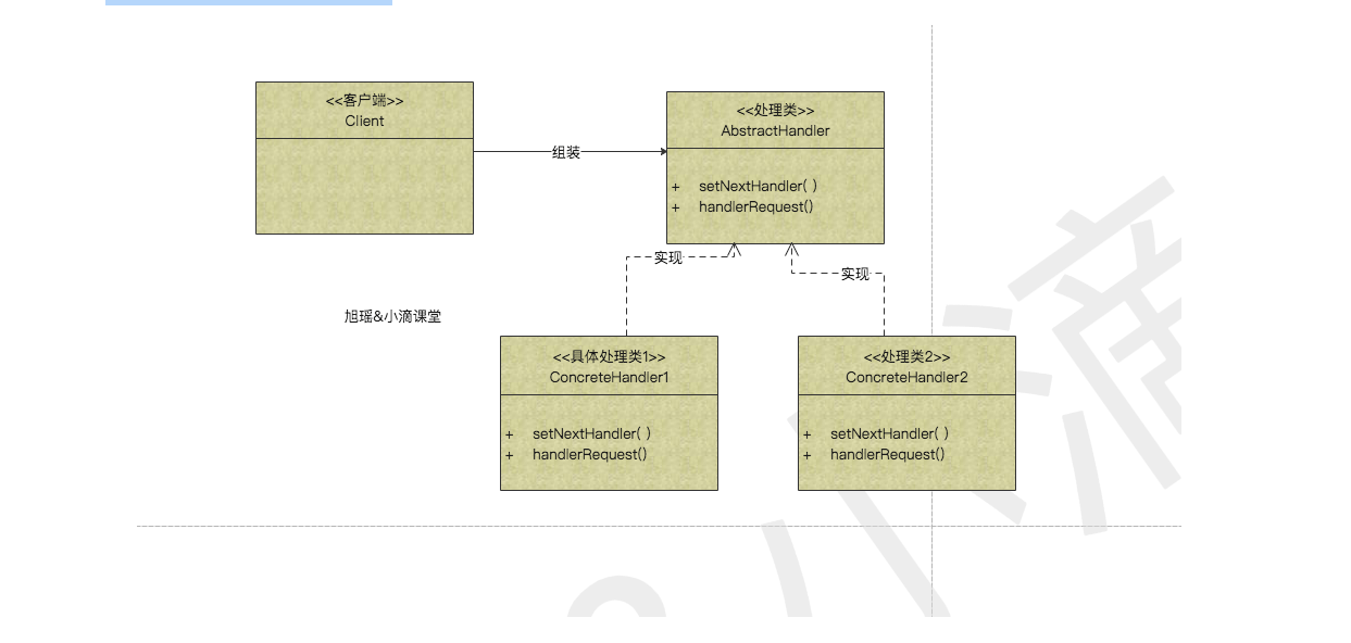 - ConcreteHandler具体处理者: 处理所负责的请求,可访问它的后续节点,如果可处理该请求就处理,否则就将该请求转发给它的后续节点